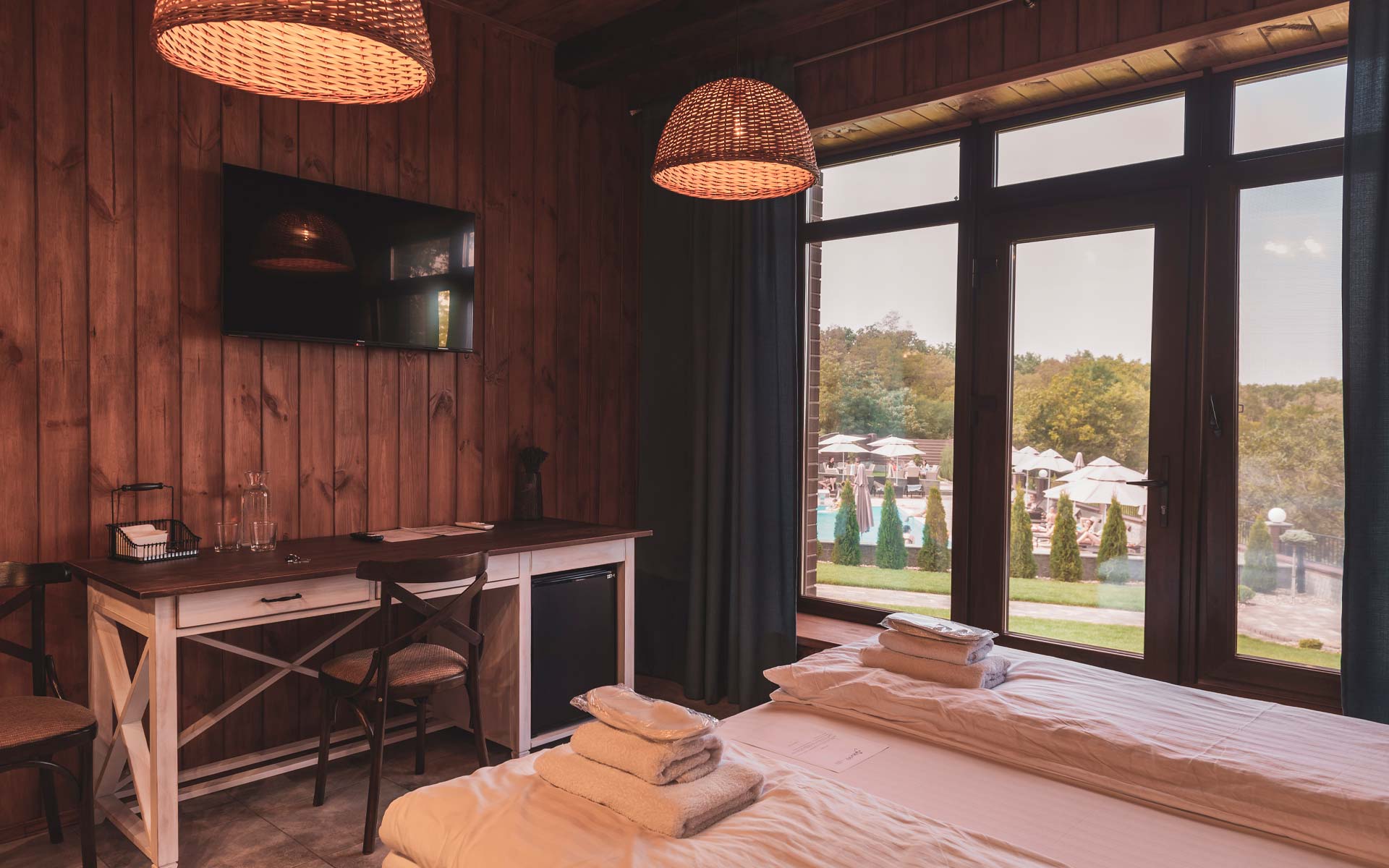 Світлий та затишний однокімнатний номер з окремим входом та гардеробною кімнатою. До послуг гостей окрема душева кімната та санвузол з банними халатами, капцями та туалетно-косметичними засобами.